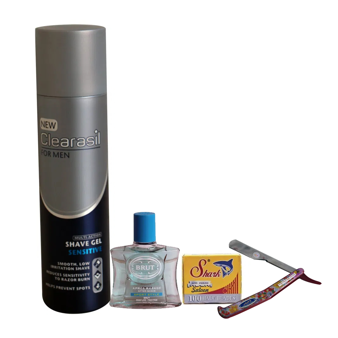 CLEARASIL SHAVE GEL – 200ML BRUT AFTERSHAVE 100ML SHARK SINGLE EGED RAZOR BLADE Cut-throat
